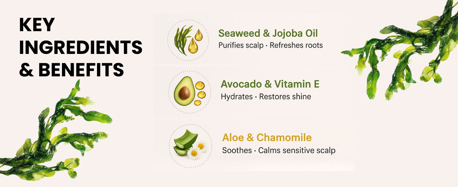 Seaweed, avocado, aloe, jojoba, chamomile, and vitamin E — each ingredient chosen to balance the scalp, nourish hair, and restore natural vitality.