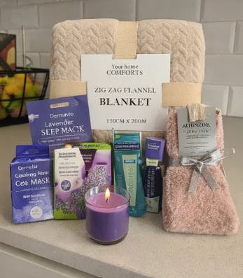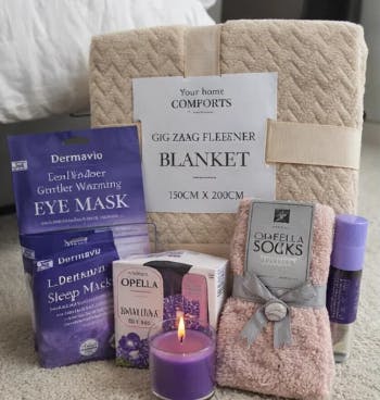 Each item in the set promotes calmness and rejuvenation, enhancing both body and mind. The aromatherapy roll-on and sleep patch offer instant relaxation, while the coconut lip oil and moisturising socks ensure lasting hydration. Light the fragrant candle, allow the warming eye mask to ease tension, and cocoon yourself in the plush flannel blanket for a retreat that nourishes and refreshes.