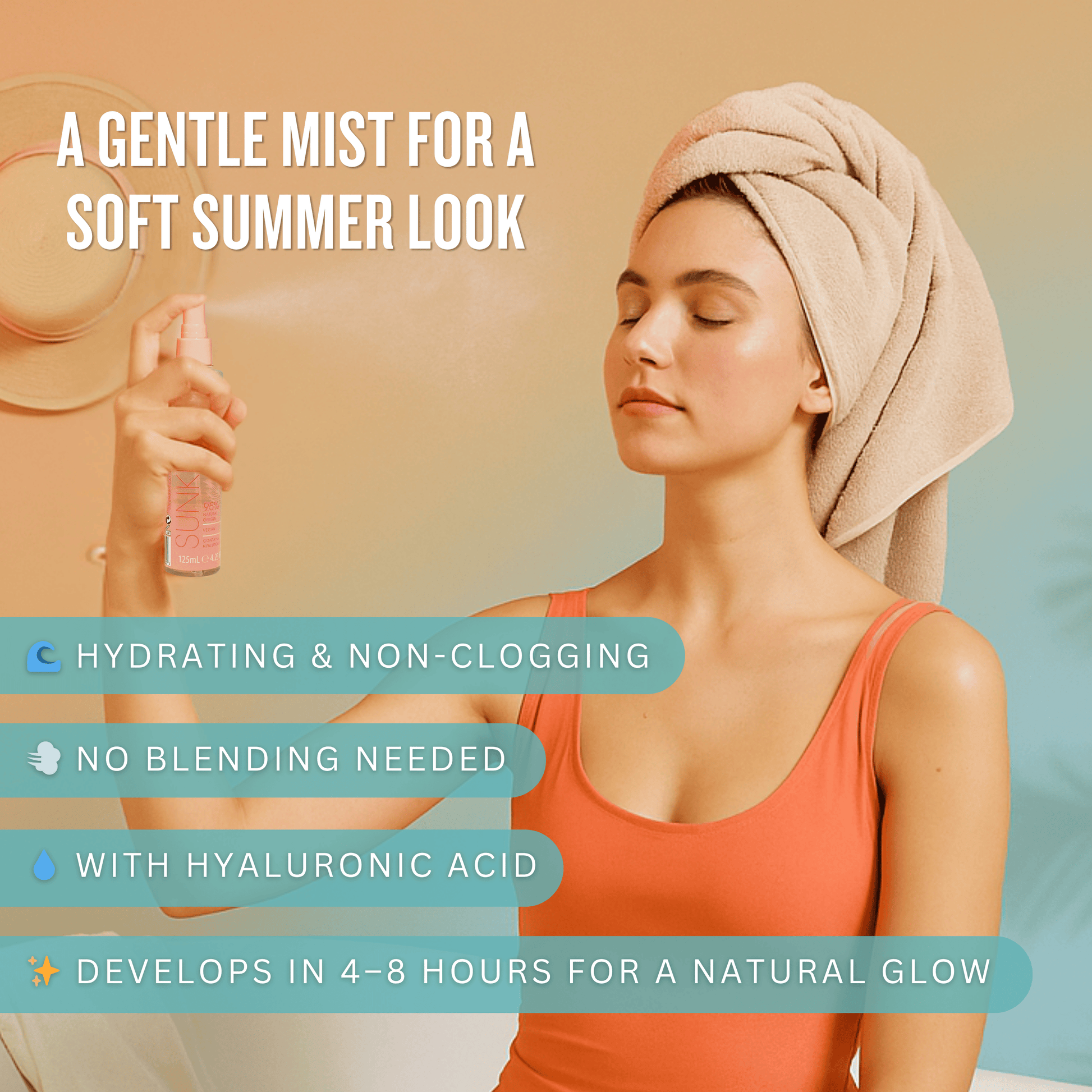 - Natural Face Glow: Lightweight mist for a subtle, facial bronze.